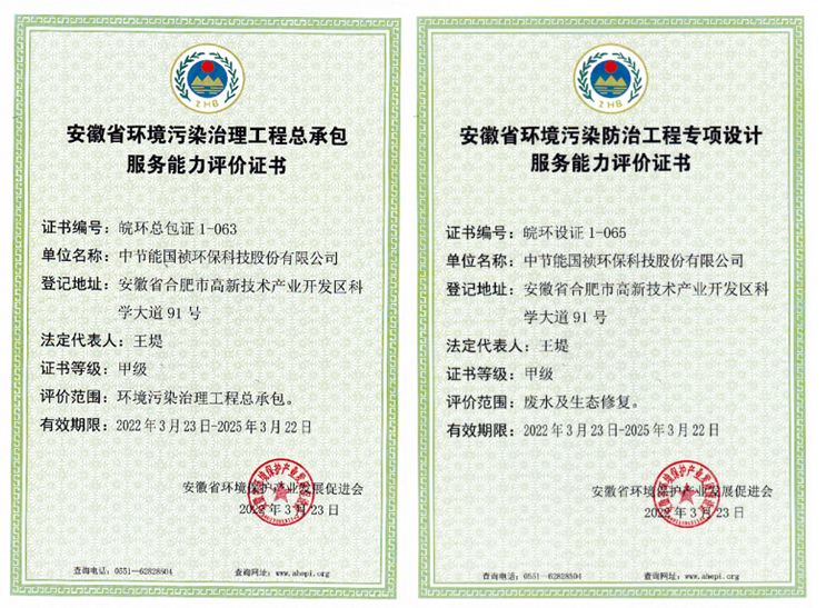 3月23日,經(jīng)過(guò)前期材料準(zhǔn)備、專家評(píng)審及實(shí)地考察,中節(jié)能?chē)?guó)禎獲得安徽省環(huán)境保護(hù)產(chǎn)業(yè)發(fā)展促進(jìn)會(huì)頒發(fā)的《安徽省環(huán)境污染治理工程總承包服務(wù)能力評(píng)價(jià)證書(shū)(環(huán)境污染治理工程總承包甲級(jí))》、《安徽省環(huán)境污染防治工程專項(xiàng)設(shè)計(jì)服務(wù)能力評(píng)價(jià)證書(shū)(廢水及生態(tài)修復(fù)甲級(jí))》兩項(xiàng)證書(shū)。